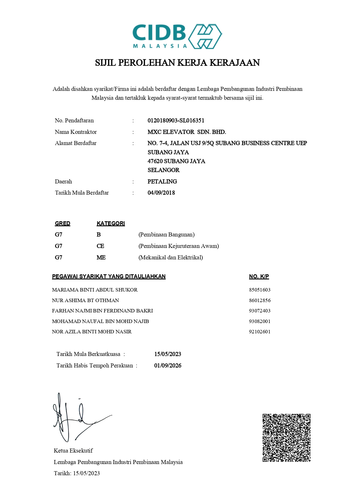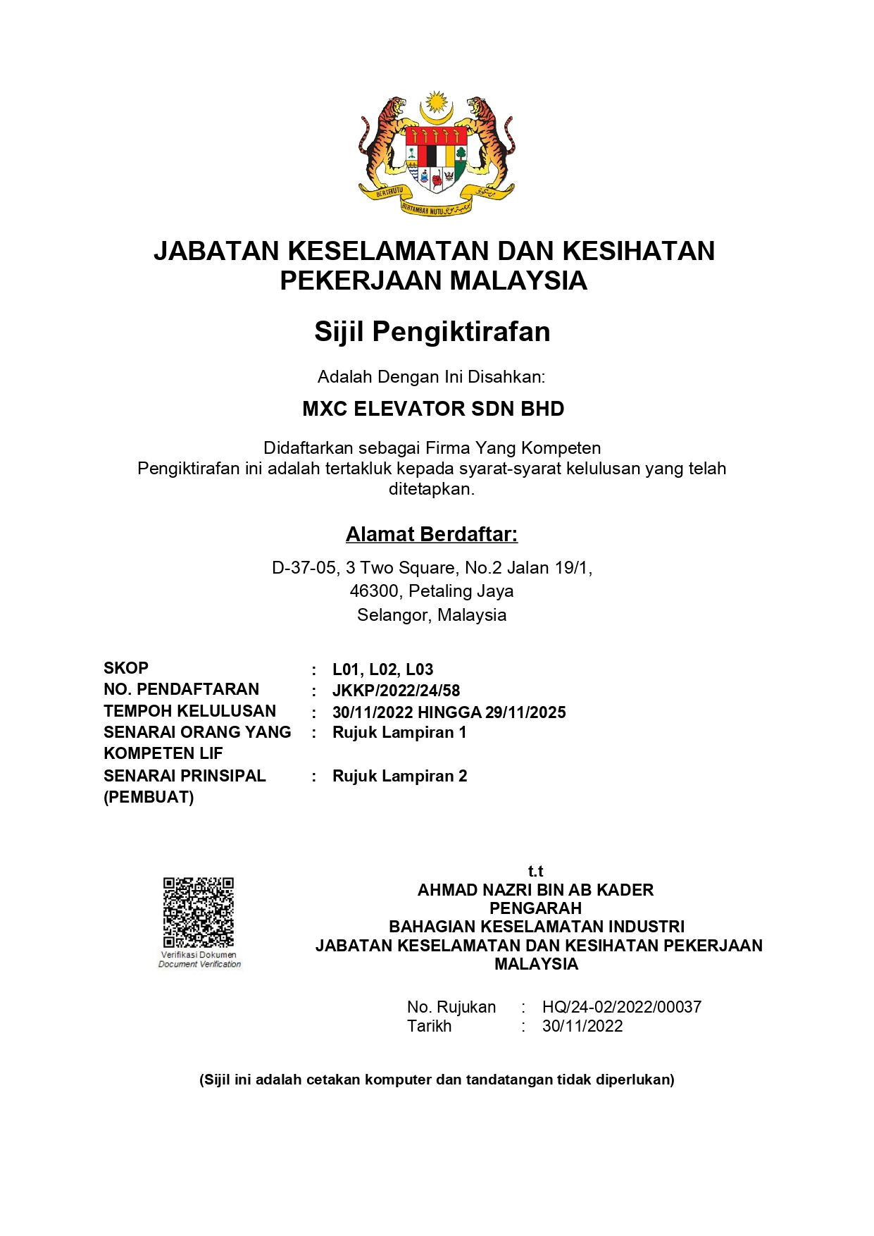 MXC Elevator is registered as Firma Yang Kompeten(FYK) with Jabatan Keselamtan Dan Kesihatan Pekerjaan (JKKP).